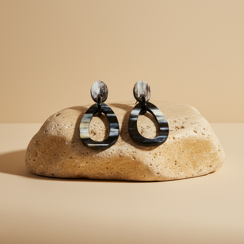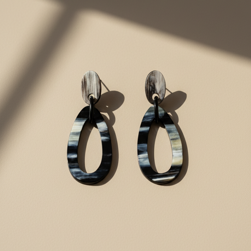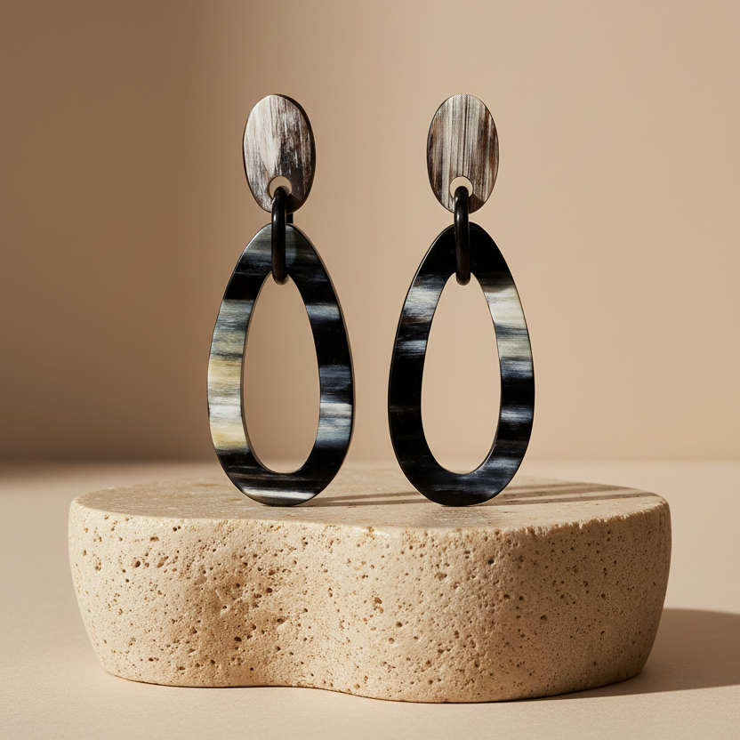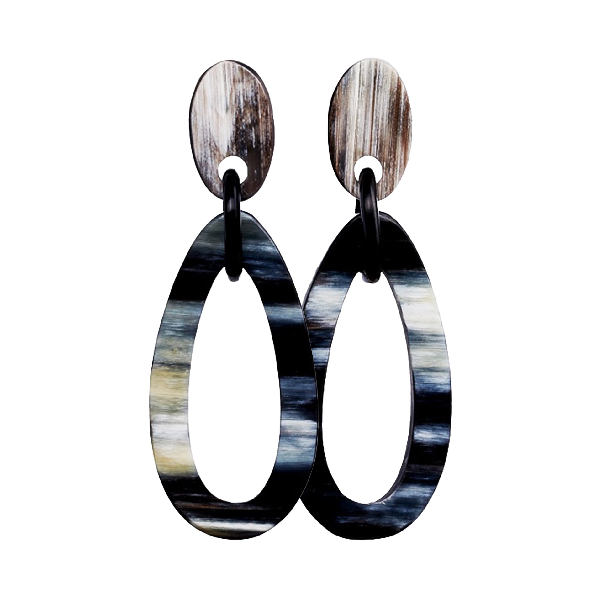 Diese handgefertigten Ohrringe sind durch ihr afrikanisches Büffelhorn ein auffälliges Statement. Bei der Wahl des Materials achten wir stets darauf, dass unser Horn von Büffeln aus einer nachhaltigen Nutztierhaltung stammt. Durch die besondere Form der Horn Elemente werden die Ohrringe zu einem echten Hingucker.