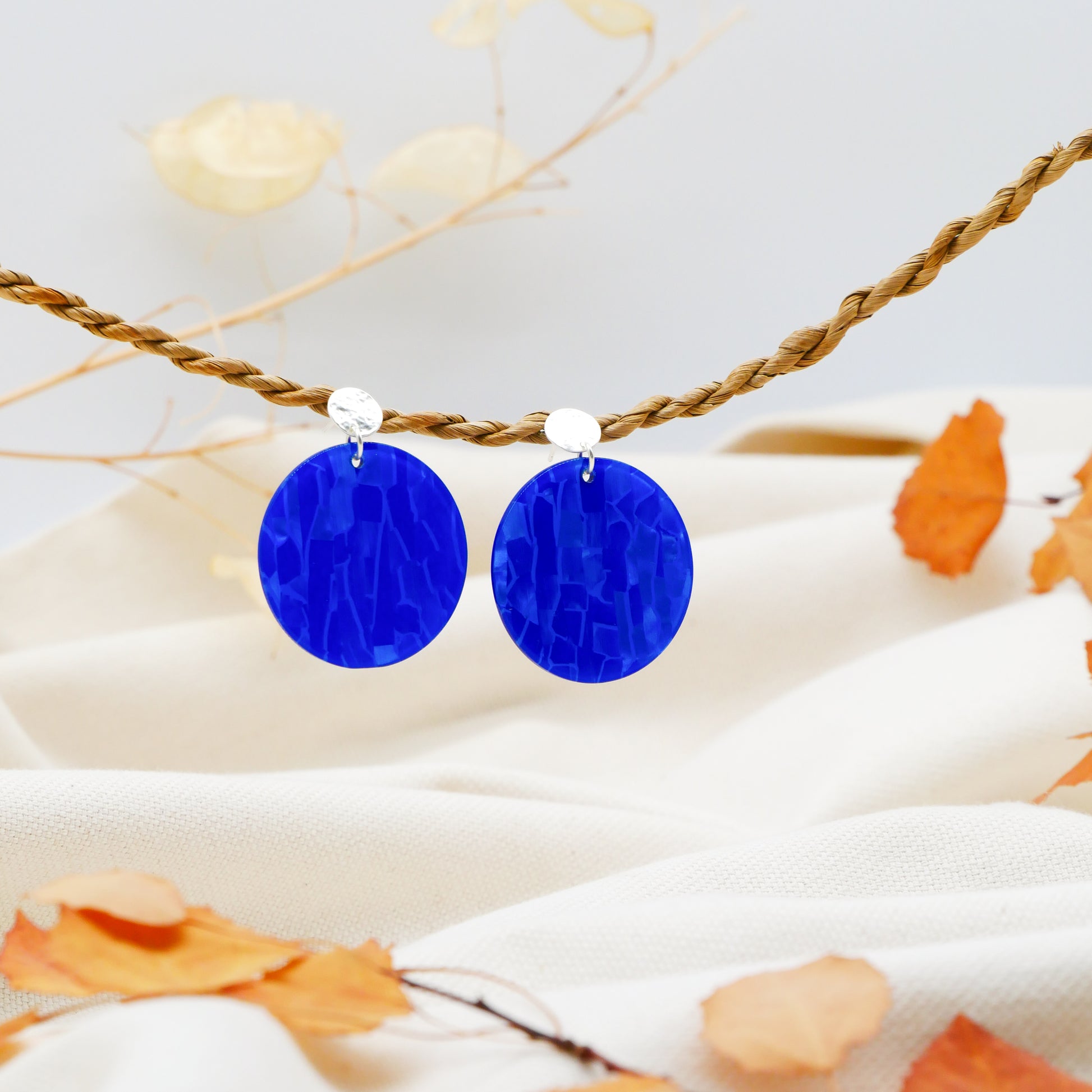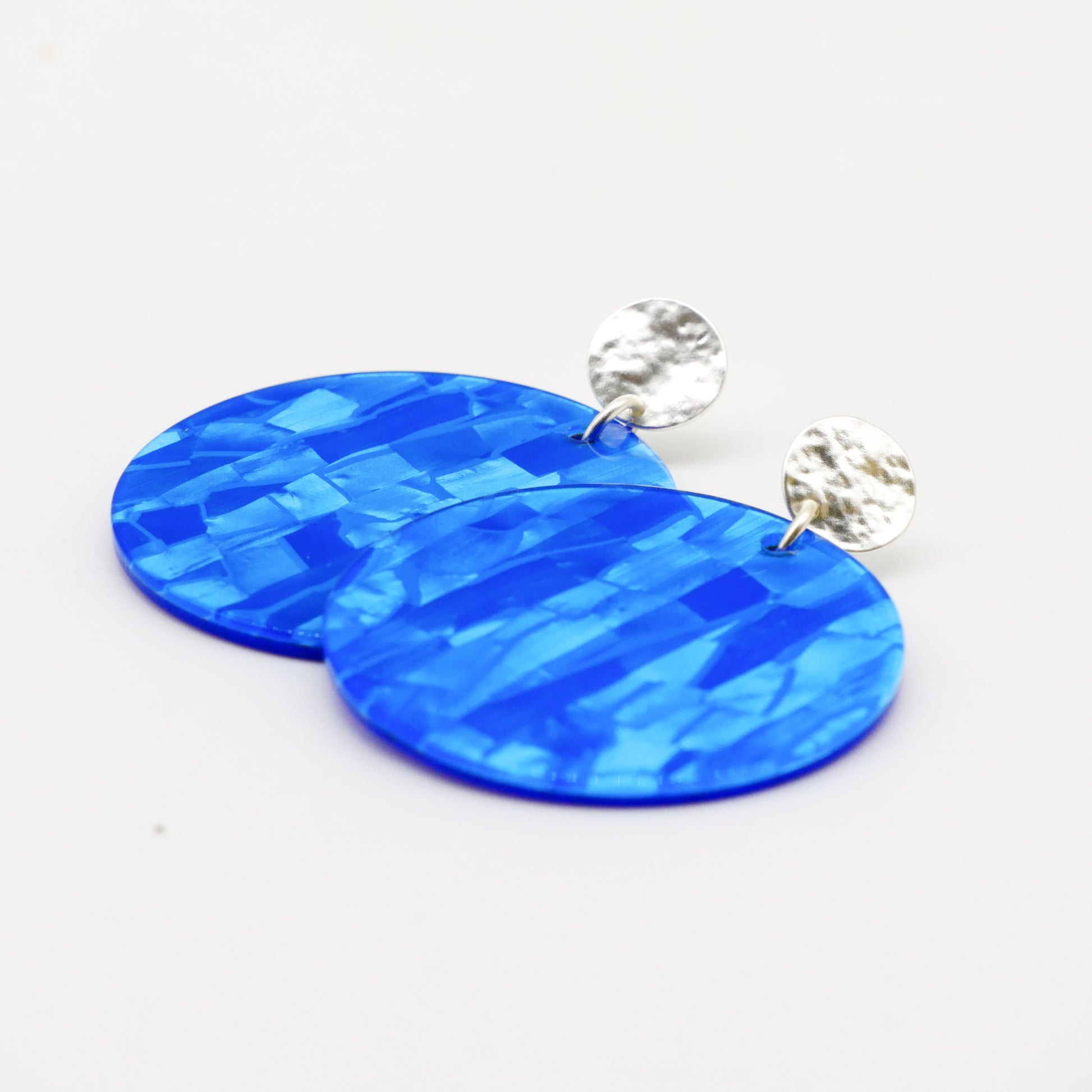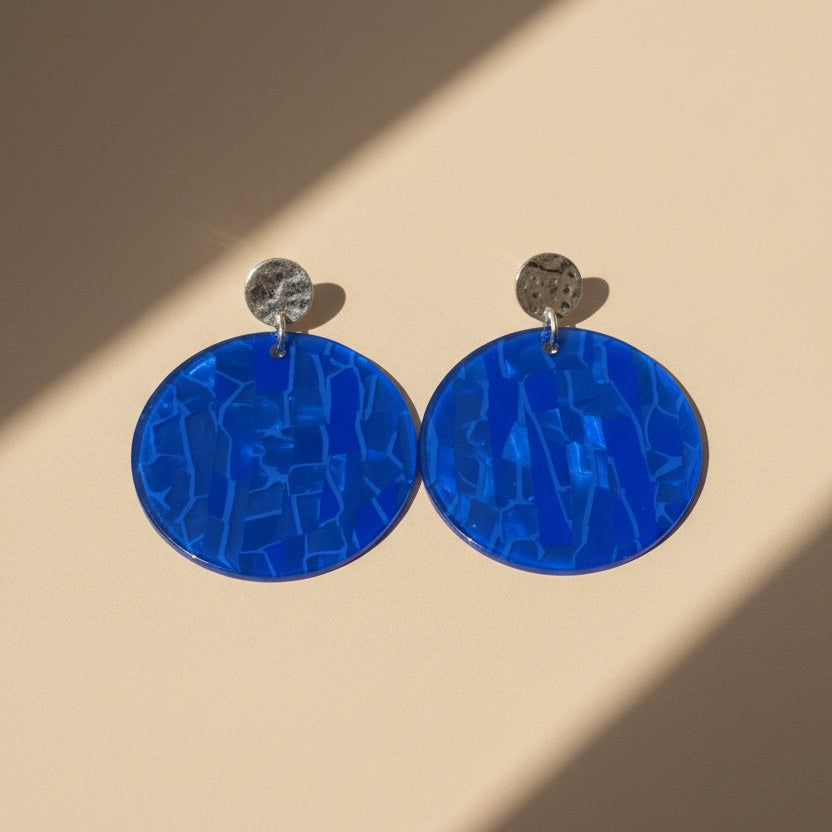 Eine intensiv blaue Acrylscheibe schafft eine moderne, lebendige Silhouette. Jede Scheibe trägt durch die natürliche Musterung des Acryls ihre ganz eigene Nuance – kleine Farbwirbel, feine Schattierungen und sanfte lichtdurchlässige Effekte, die jeden Ohrring zum Unikat machen. Leicht, auffällig und voller Charakter – ein perfektes Statement für alle, die Farbe lieben.
