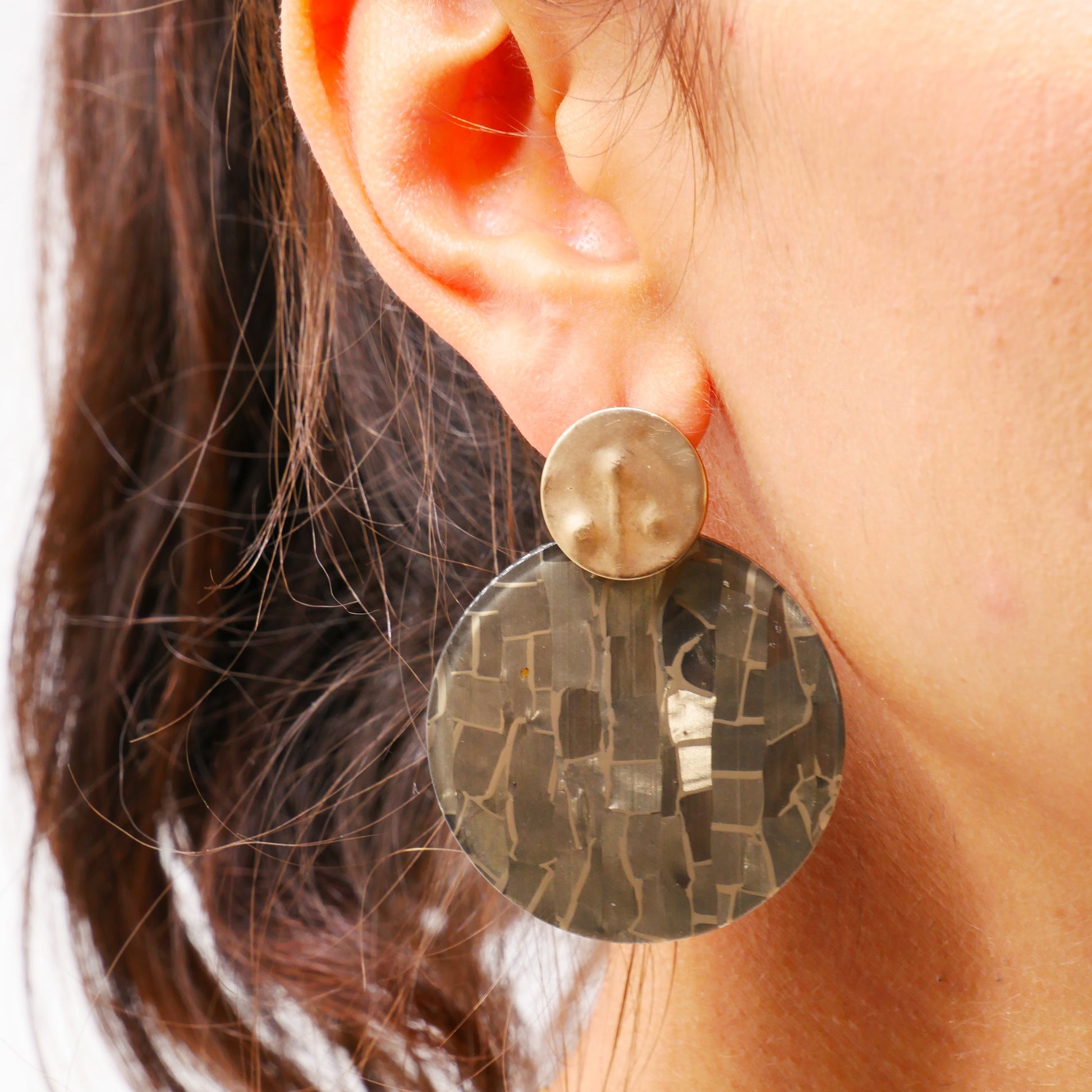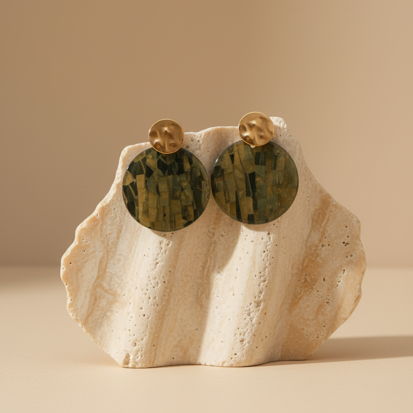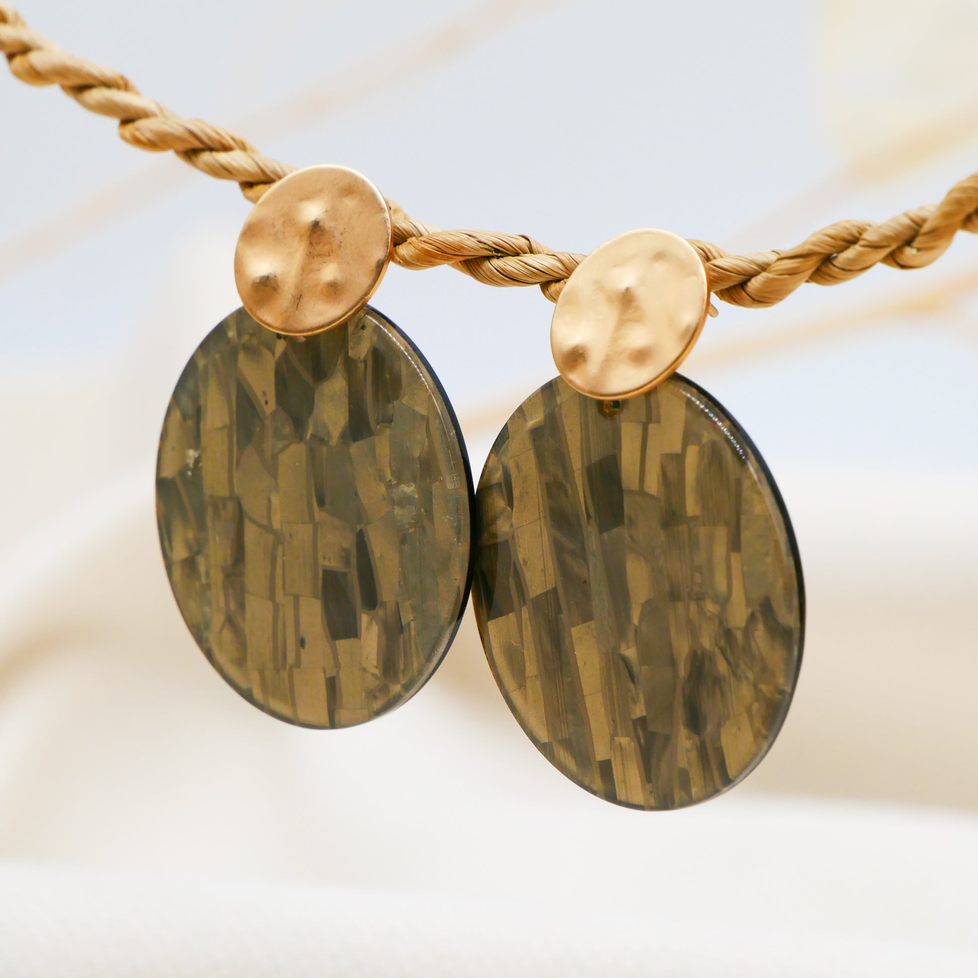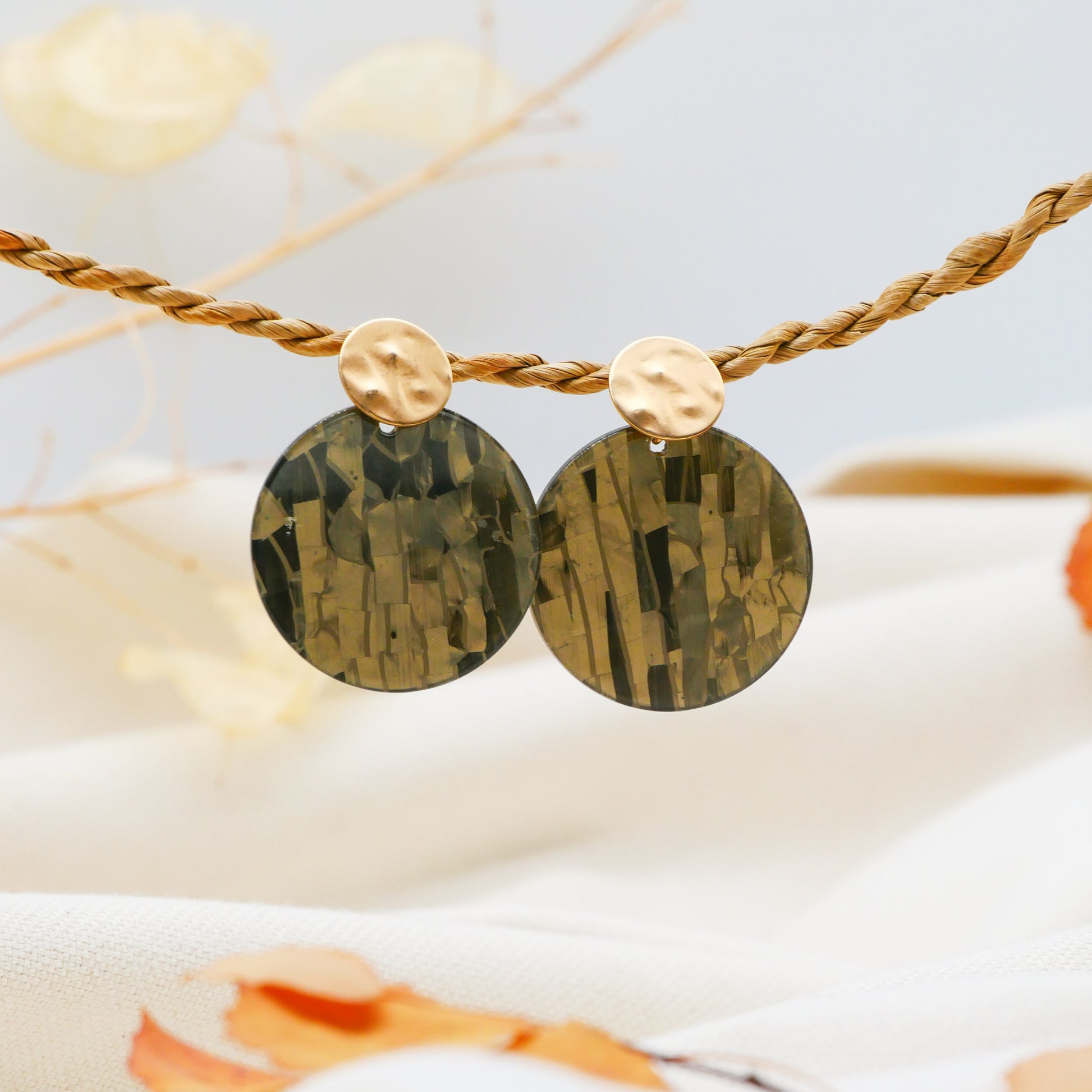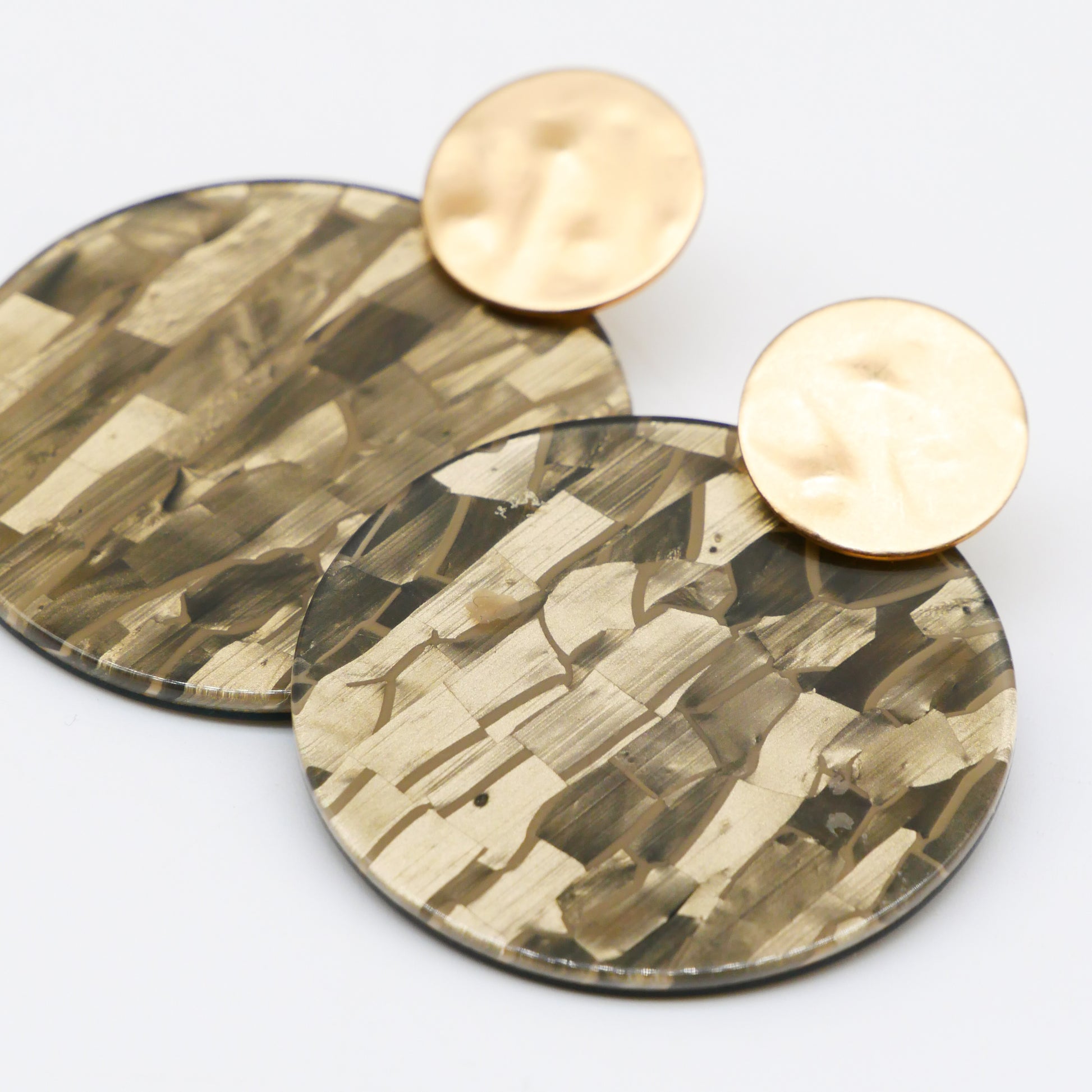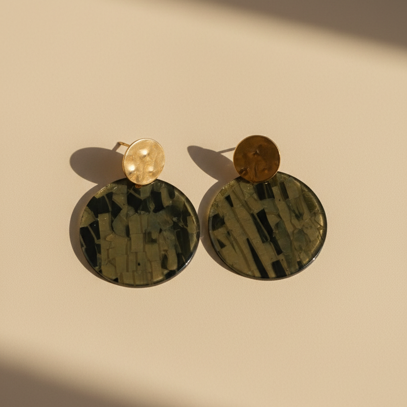 Die grau-grüne Acrylscheibe schafft eine moderne, lebendige Silhouette. Jede Scheibe trägt durch die natürliche Musterung des Acryls ihre ganz eigene Nuance – kleine Farbwirbel und feine Schattierungen, die jeden Ohrring zum Unikat machen. Leicht, auffällig und voller Charakter – ein perfektes Statement für alle, die Ohrringe lieben.