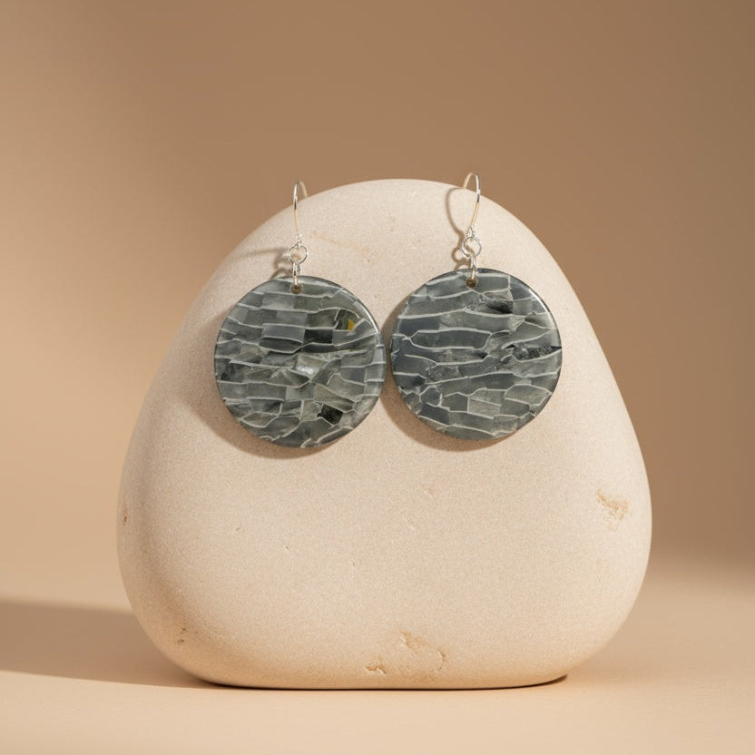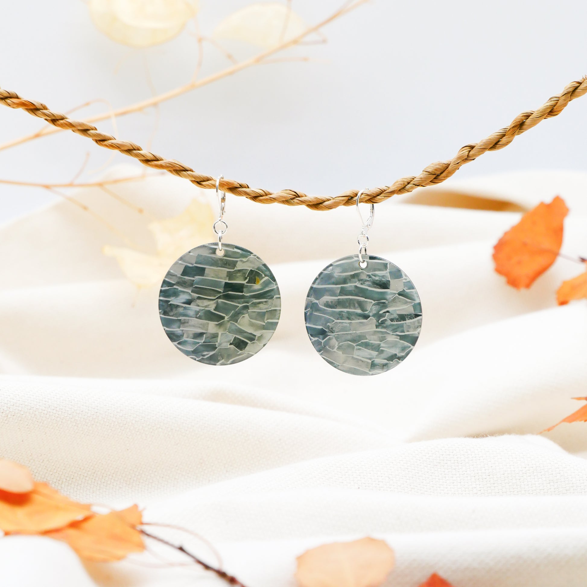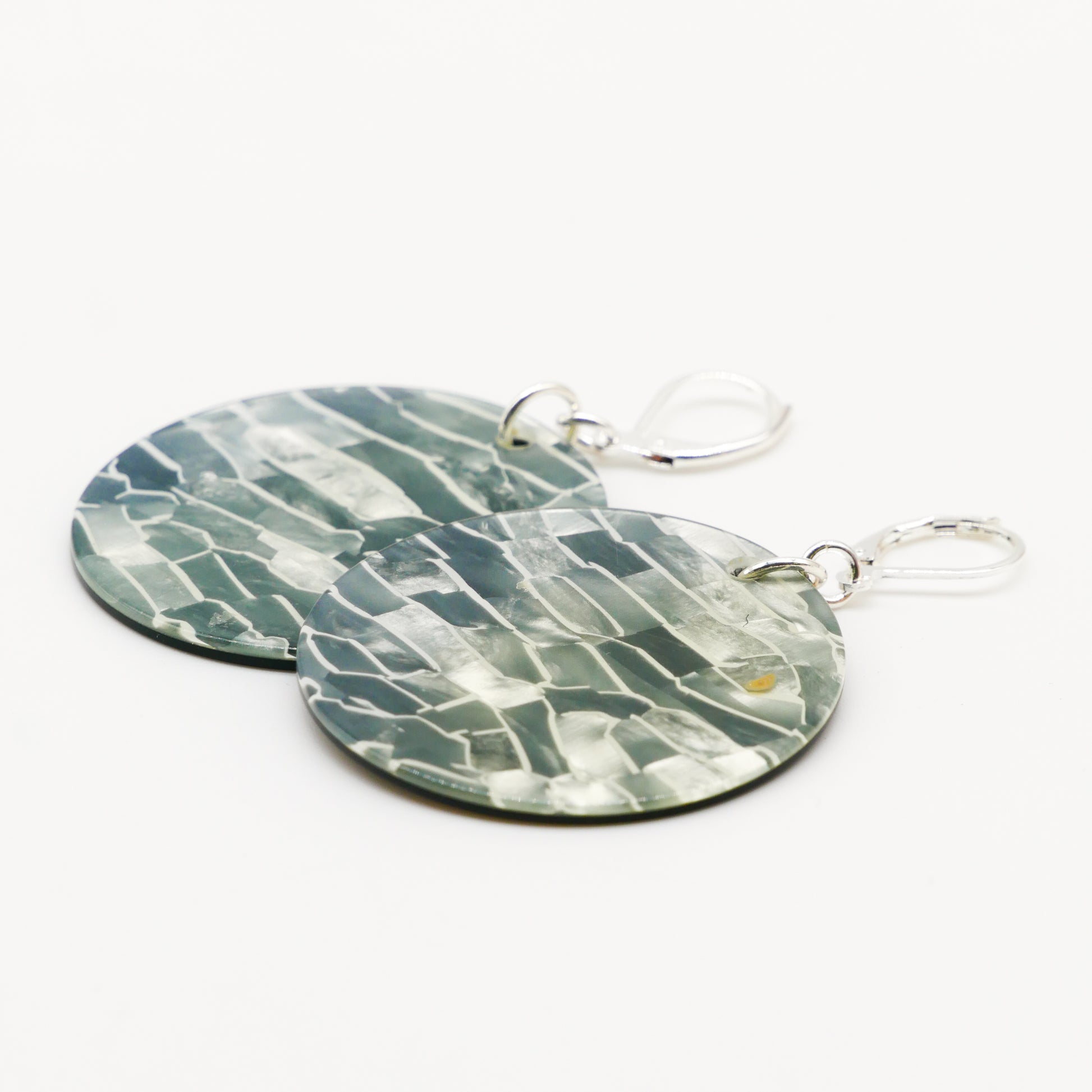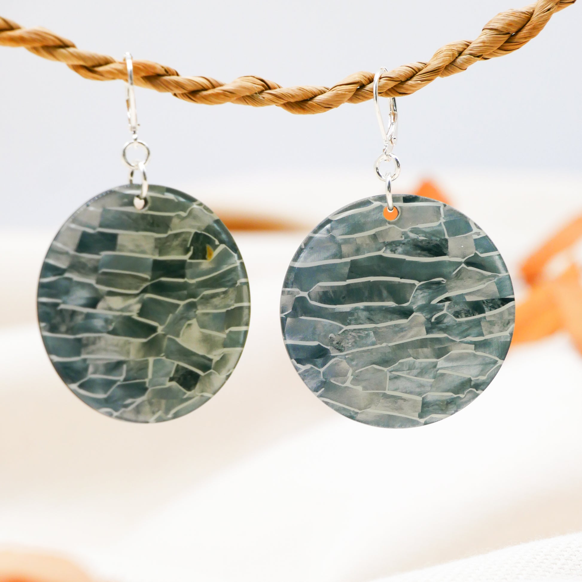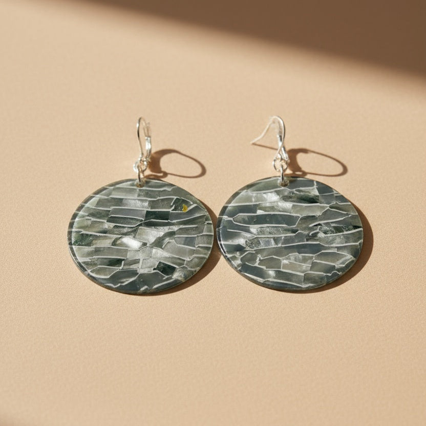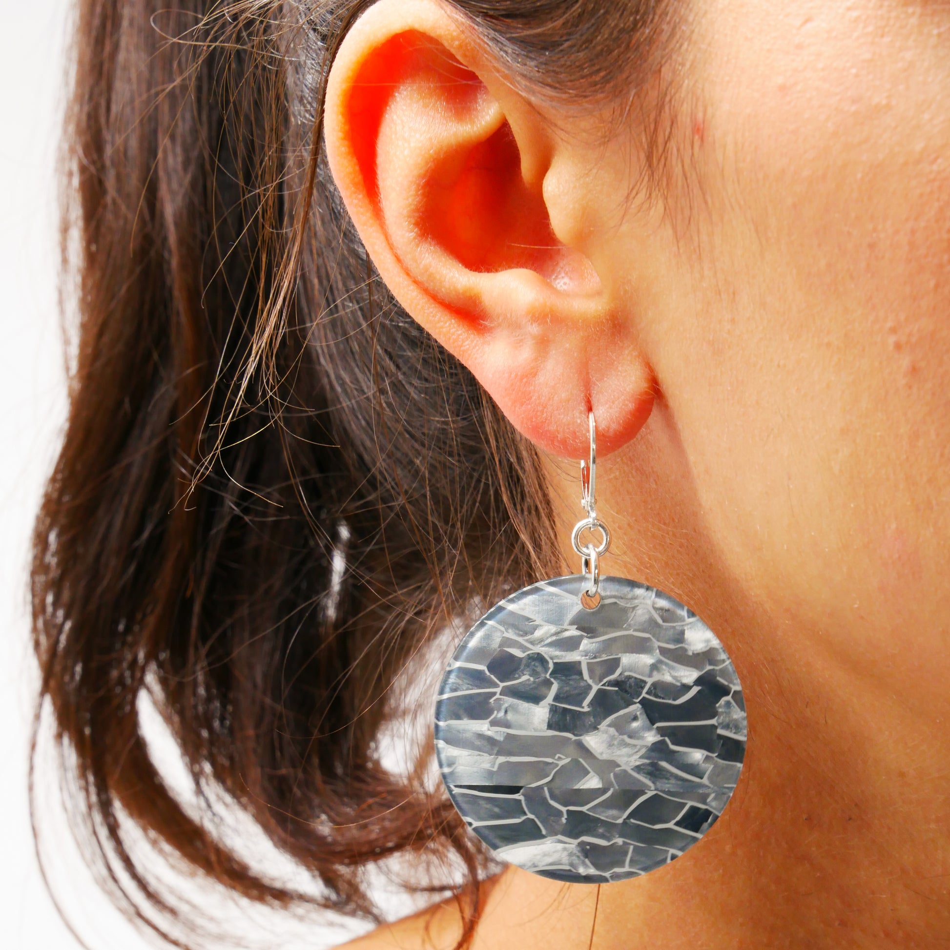 Die graue Acrylscheibe schafft eine moderne, lebendige Silhouette. Jede Scheibe trägt durch die natürliche Musterung des Acryls ihre ganz eigene Nuance – kleine Farbwirbel und feine Schattierungen, die jeden Ohrring zum Unikat machen. Leicht, auffällig und voller Charakter – ein perfektes Statement für alle, die Ohrringe lieben.