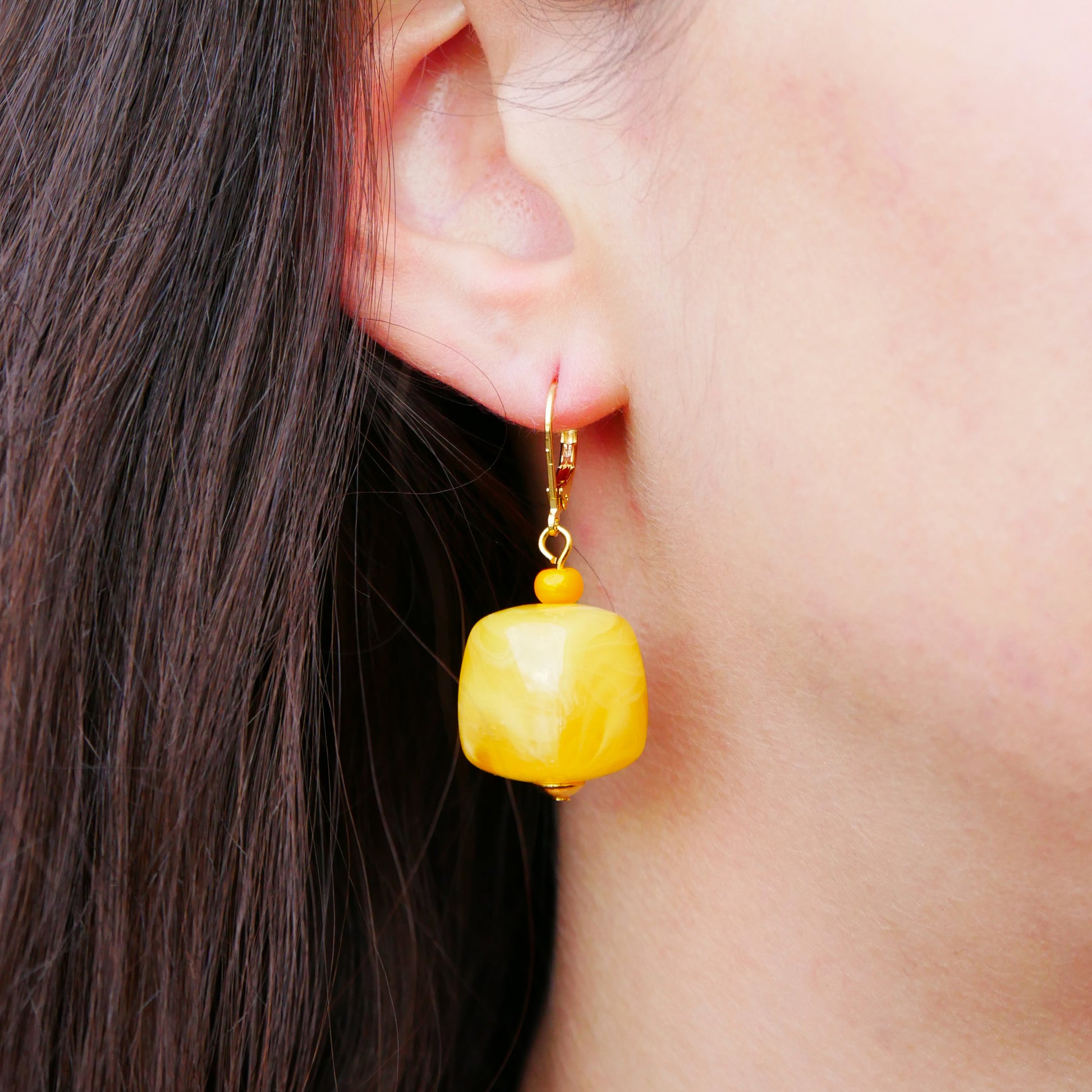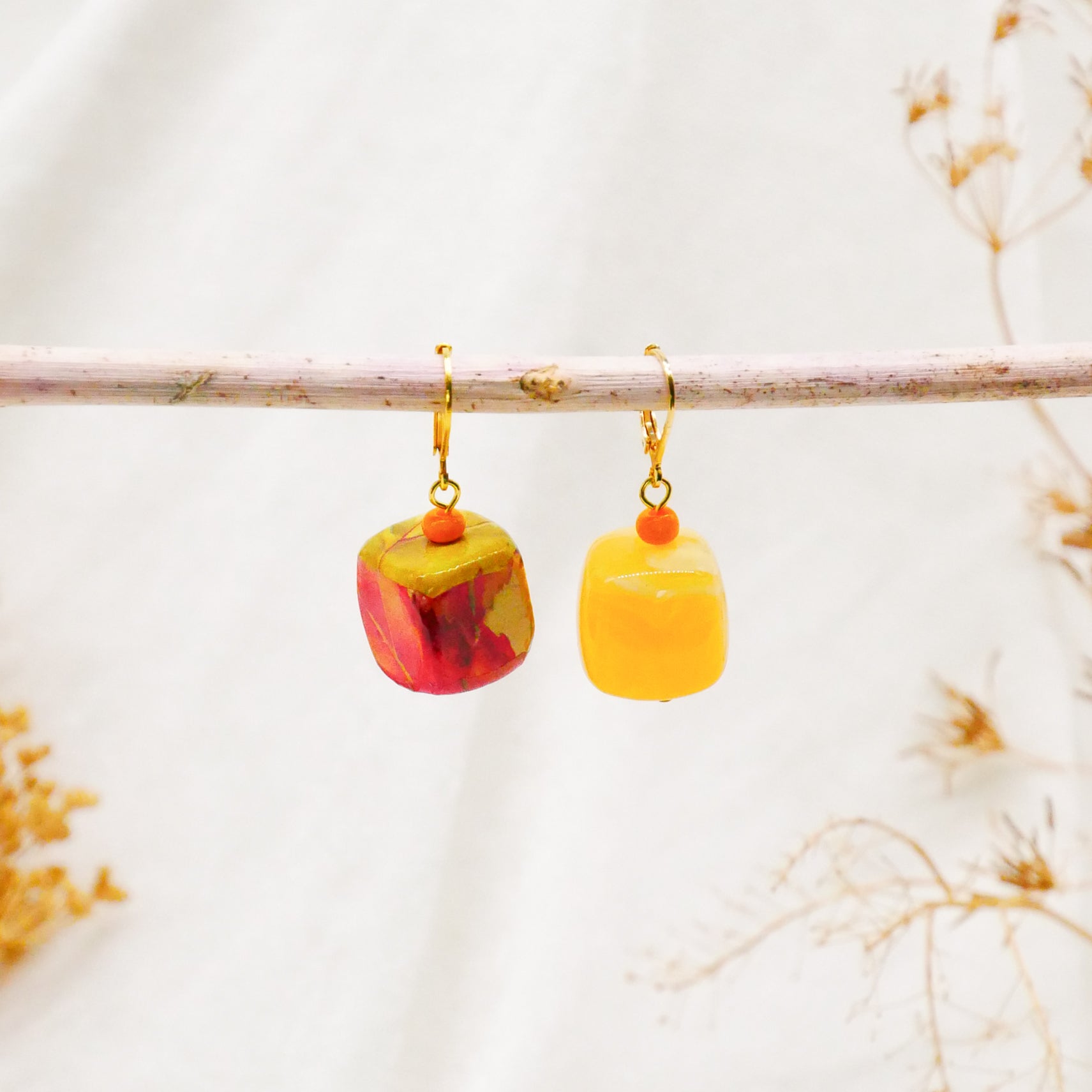 Diese Ohrhänger zaubern sofort Frühlings- und Sommerlaune ins Outfit. Eine Perle ist liebevoll mit Papier bezogen, die andere besteht aus strahlendem Resin – zusammen verleihen sie jedem Paar einen einzigartigen, lebendigen Charakter.