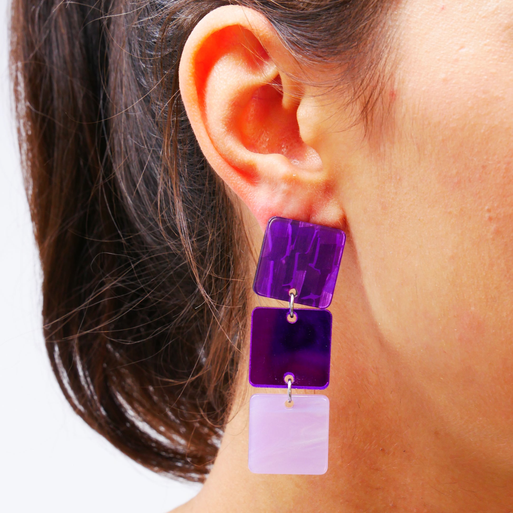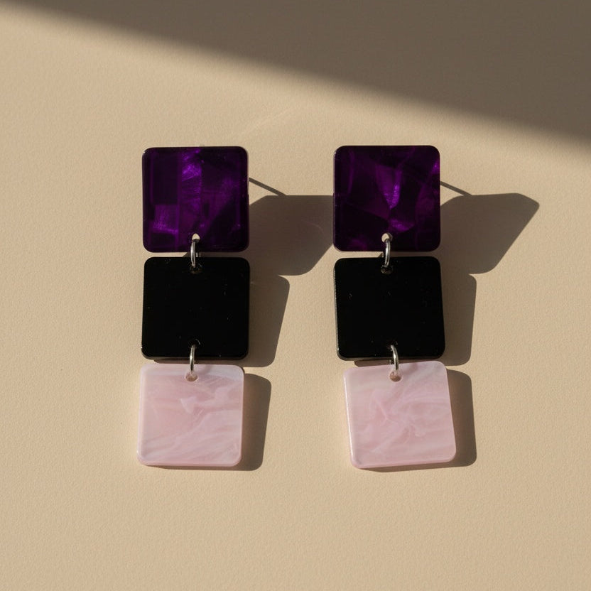 Drei Acrylscheiben hängen spielerisch untereinander und schaffen so eine moderne, lebendige Silhouette. Jede Scheibe trägt durch die natürliche Musterung des Acryls ihre ganz eigene Nuance – kleine Farbwirbel, feine Schattierungen und lichtdurchlässige Effekte, die jeden Ohrring zum Unikat machen. Leicht, auffällig und voller Charakter – ein perfektes Statement für alle, die Farbe lieben.