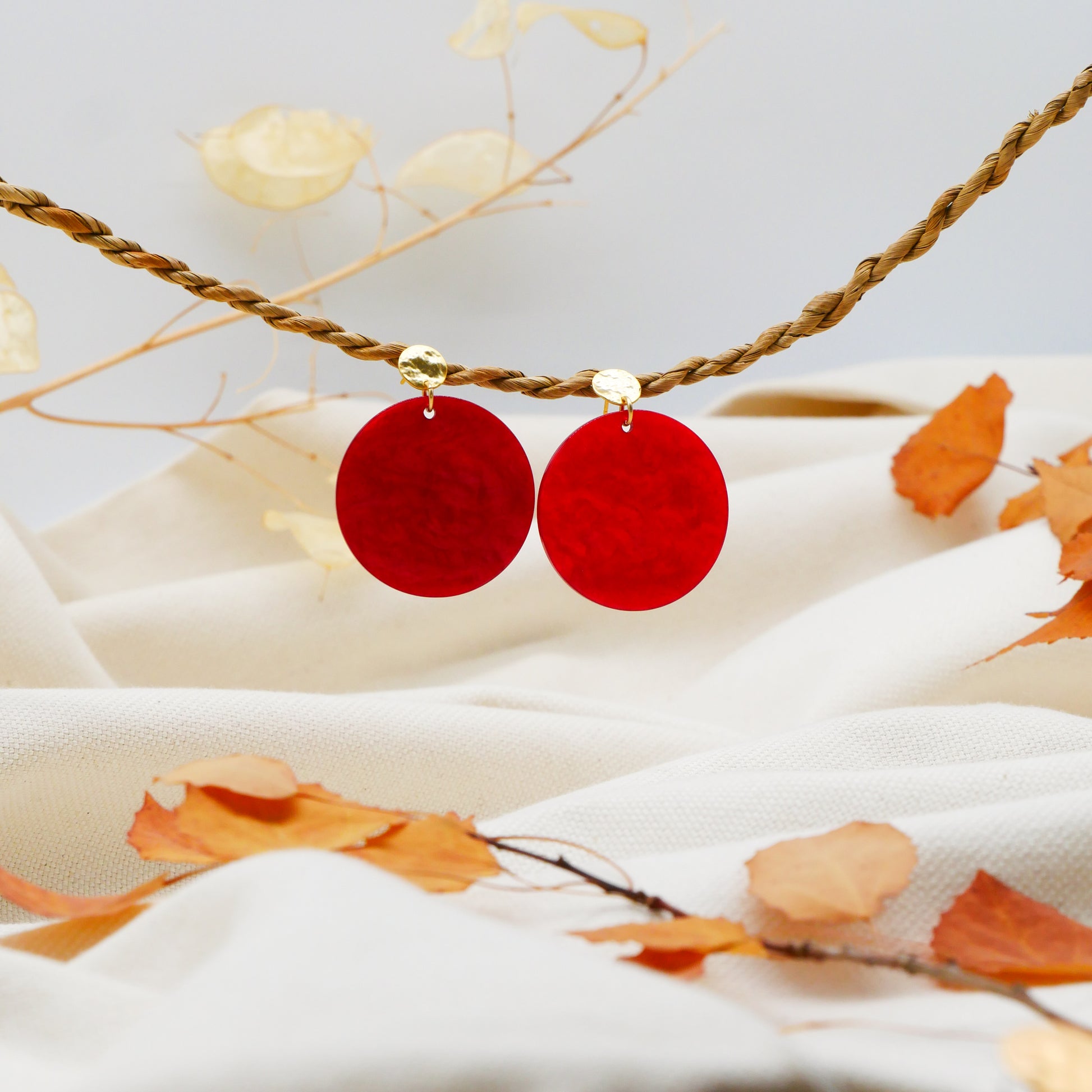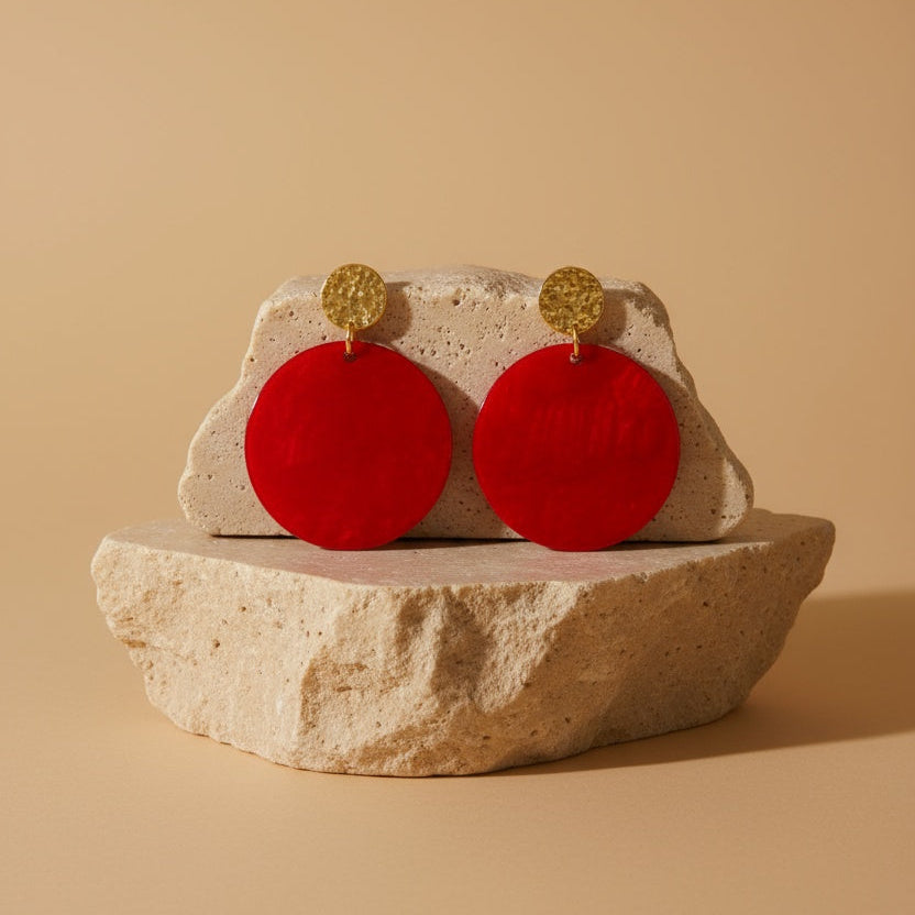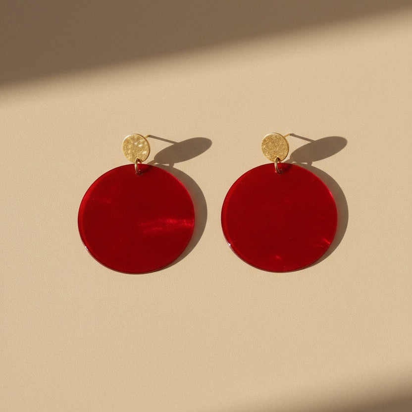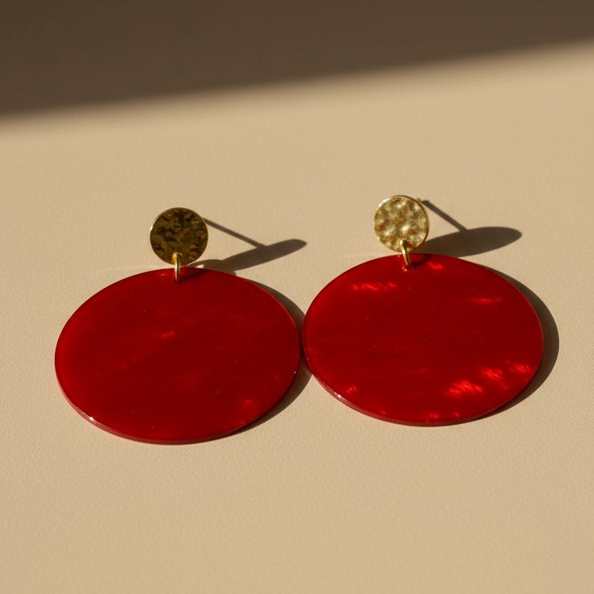 Eine intensiv rote Acrylscheibe schafft eine moderne, lebendige Silhouette. Jede Scheibe trägt durch die natürliche Musterung des Acryls ihre ganz eigene Nuance – kleine Farbwirbel, feine Schattierungen und sanfte lichtdurchlässige Effekte, die jeden Ohrring zum Unikat machen. Leicht, auffällig und voller Charakter – ein perfektes Statement für alle, die Farbe lieben.