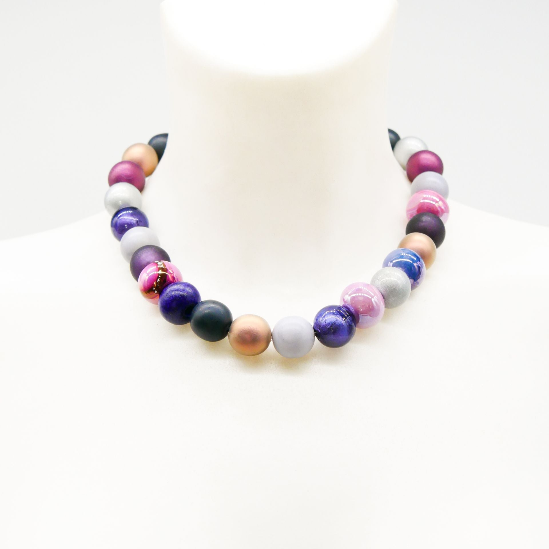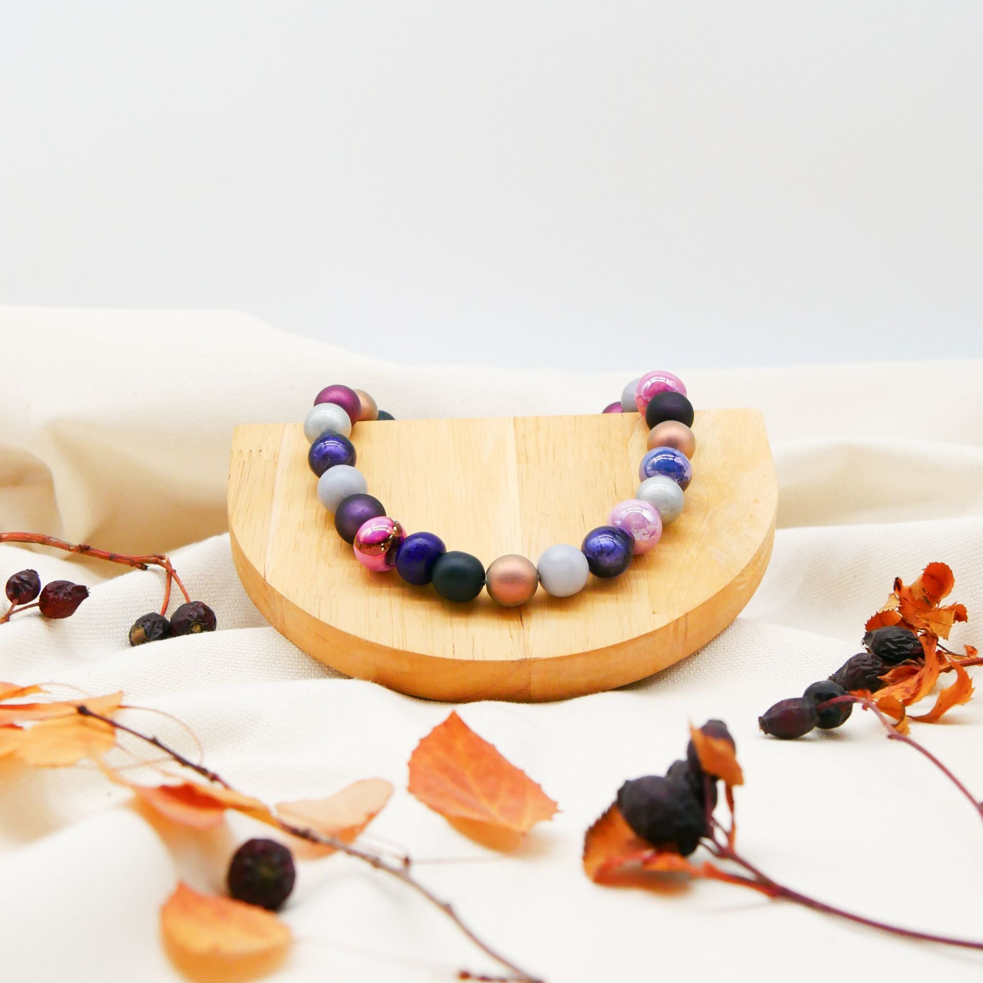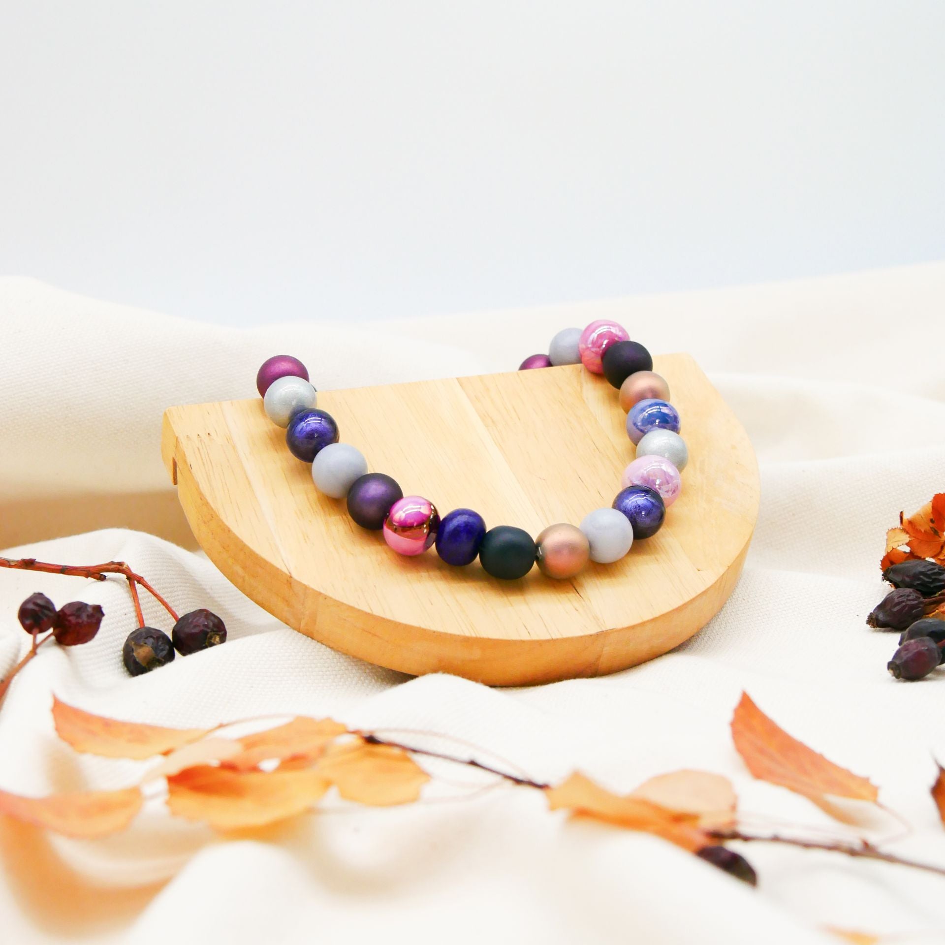 Diese Kette verzaubert mit ihrer harmonischen Farbkomposition aus zarten Lilatönen. Sie strahlt eine feine Balance zwischen Verspieltheit und Eleganz aus und setzt sanfte Farbakzente, die jedes Outfit besonders machen.