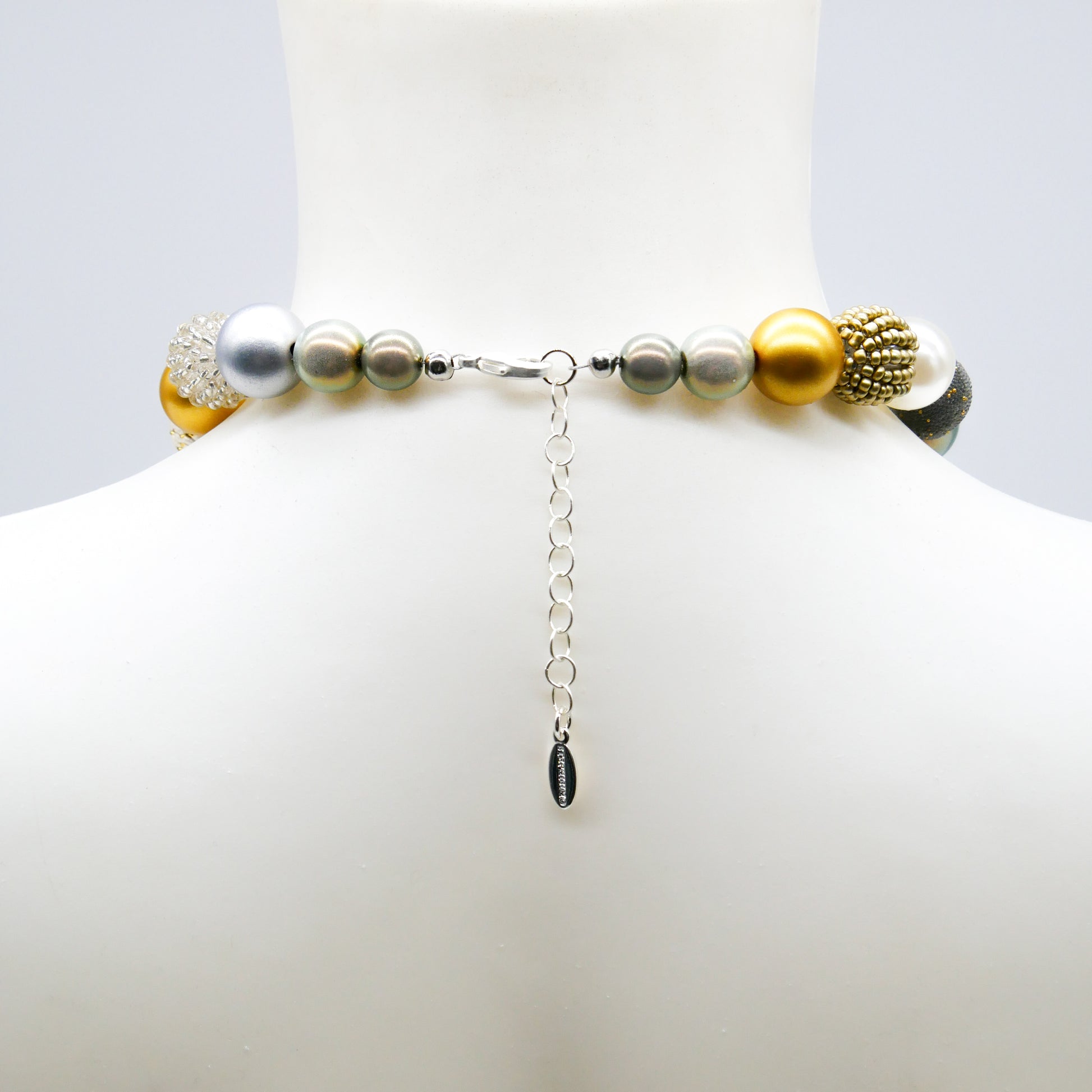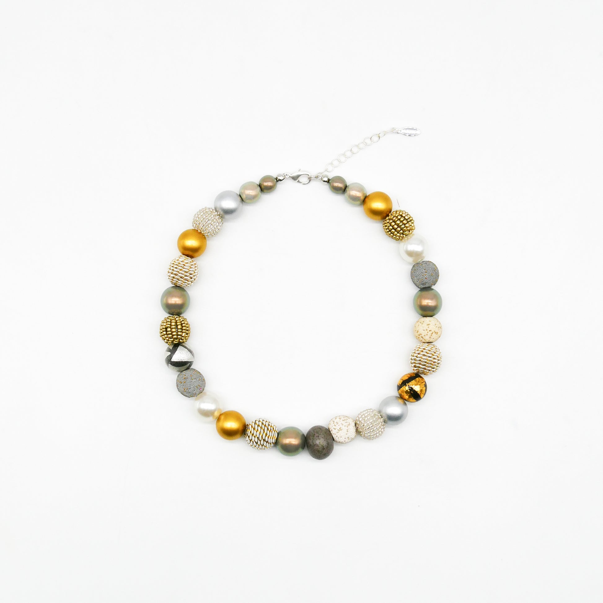 Der vielseitige Materialmix aus unterschiedlichen Perlenarten verleiht der Kette eine lebendige Struktur und einen dezenten Glanz.