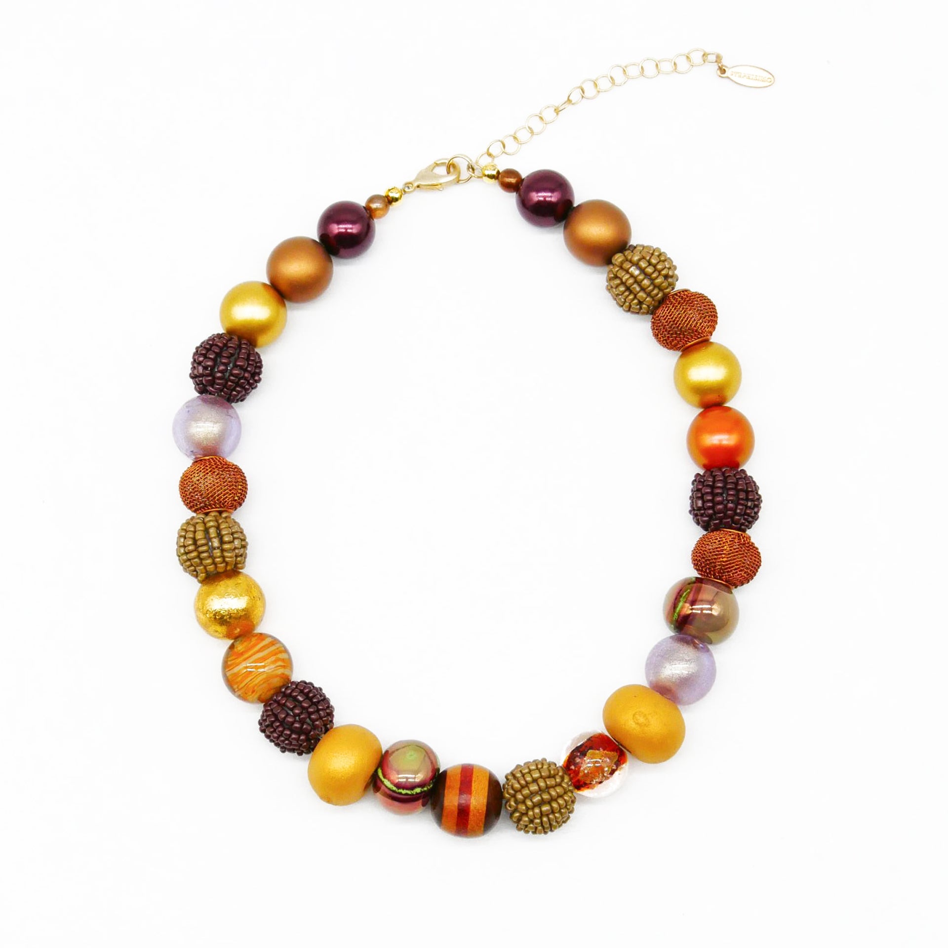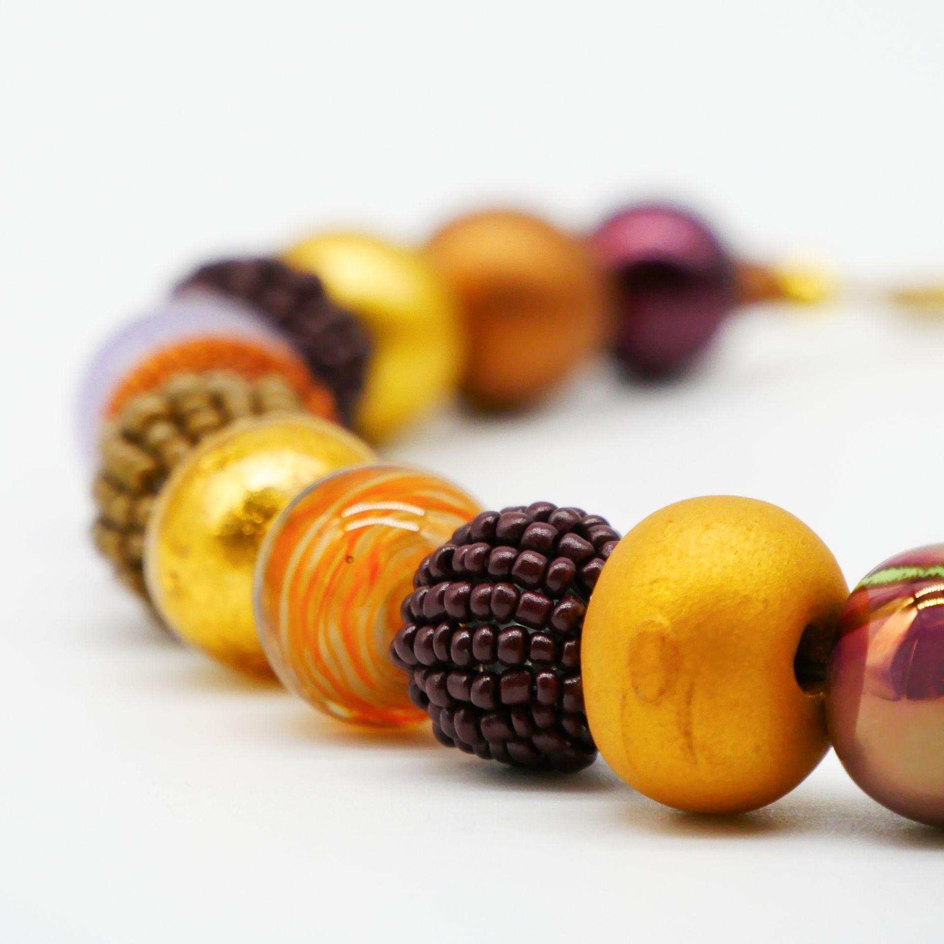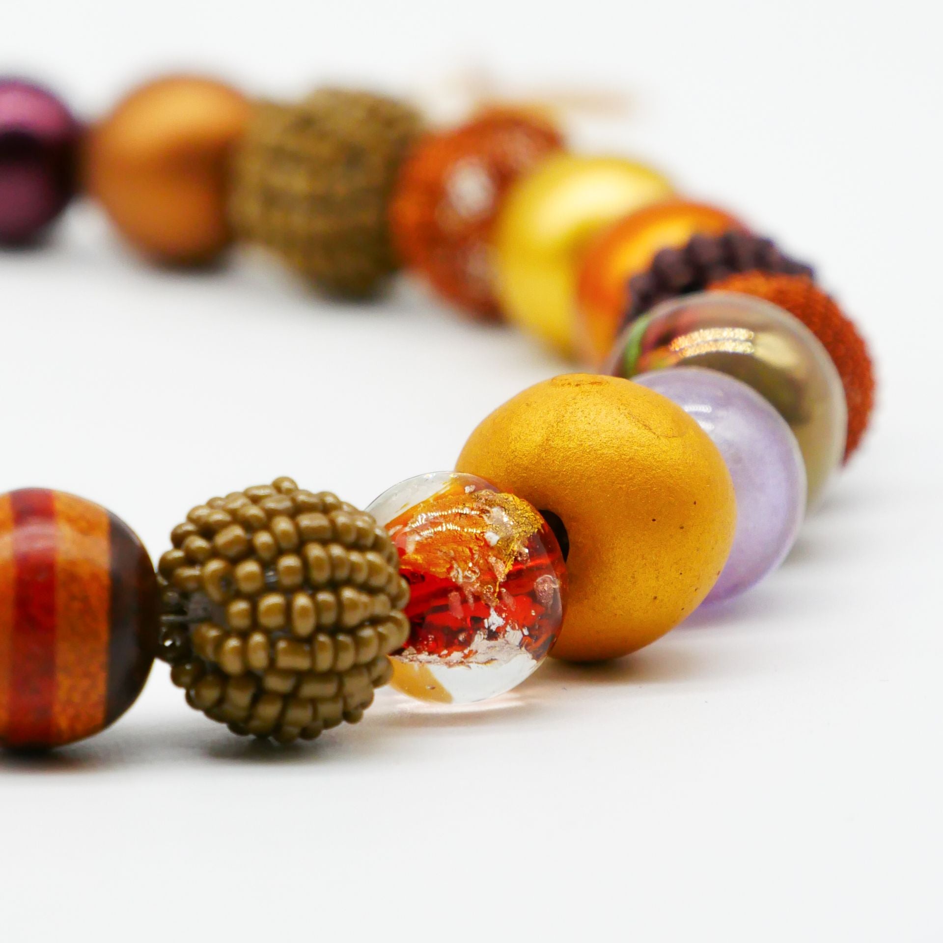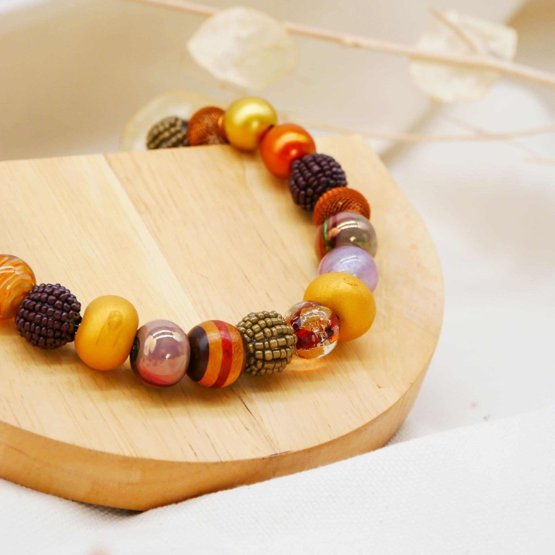 Diese Kette vereint natürliche Eleganz und modernen Charme in einem besonderen Schmuckstück. Die Kombination aus sanften Orangetönen und feinen verschiedenen roten und lila Farbakzenten verleiht ihr eine harmonische Ausstrahlung, die an warme Sonnenstrahlen.
